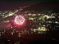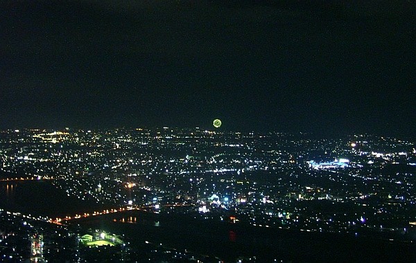 また当日は、遥か遠くで花火が盛んに打ち上げられていました。それがかわいらしく見えています。手前の黒く横たわる帯は長良川で、右下辺りで鵜飼が行われているのです。
