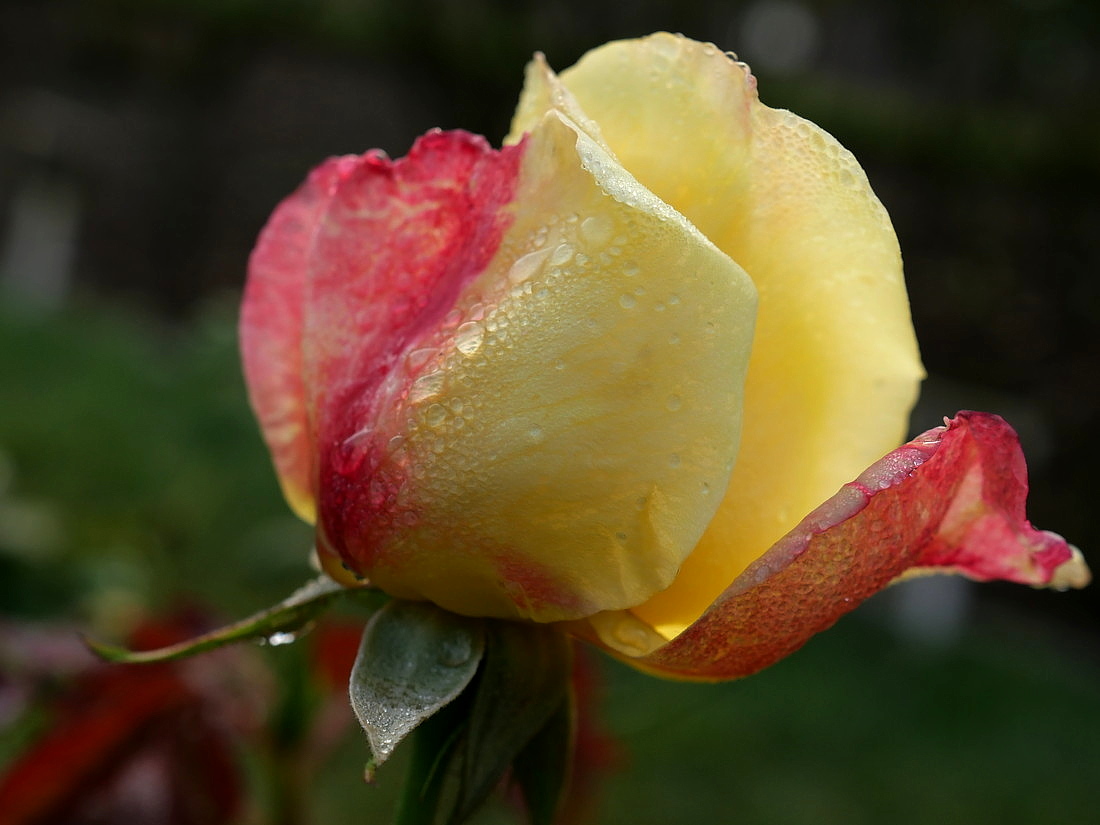 秋バラの蕾です。黄色の花弁の外側が紅にそまっています。