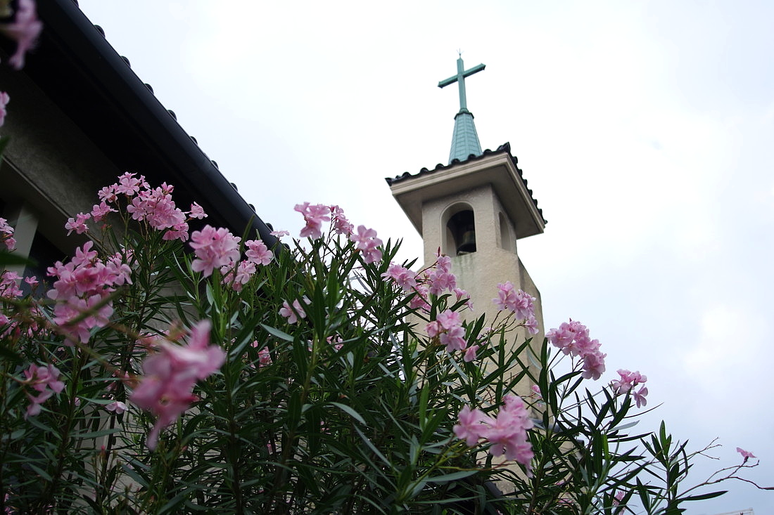 北大路に面したカトリック教会。淡いピンクの夾竹桃の花と