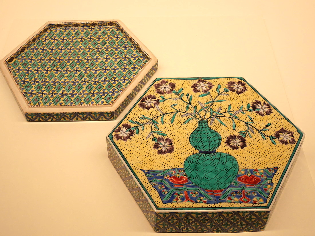 京都岡崎・京都京セラ美術館で開催されている「民芸展」。この中では一部撮影ができます。 これは宮本憲吉作「色絵飾筥」です。繊細な絵付けの美しさが極まっています。