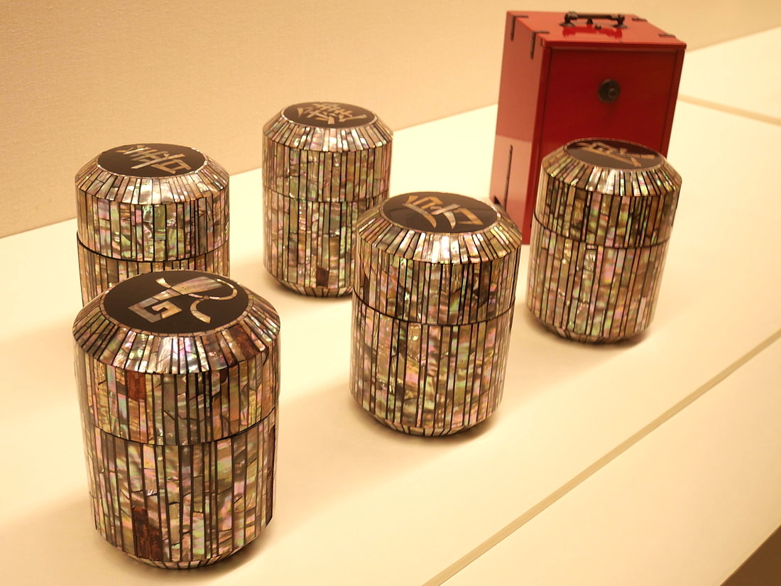 民芸展より。これは黒田辰秋による螺鈿のくずきりの容器です。螺鈿の輝きが、何とも美しい贅沢なもの。 フタには今も八坂神社の門前で営業する名店「鍵善良房」との文字が見えます。