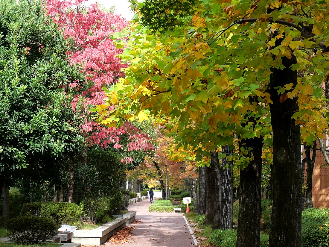 色づき始めたユリノキと桜の木の美しい散歩道。静かな秋の午後。