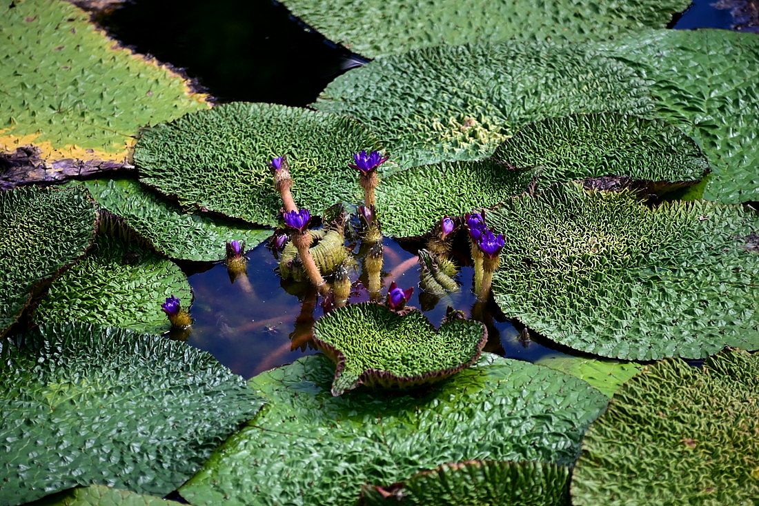 オニバスの花と激しい凹凸をもつ独特の姿の葉です。