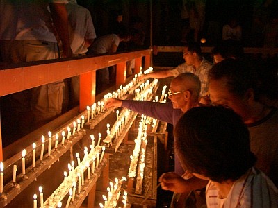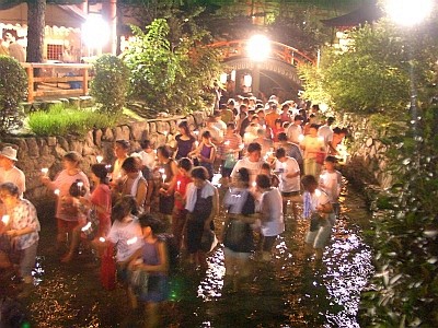 川の途中にお灯明を点けるところがあり、そこでろうそくを灯し、社の前まで冷たい水の中を歩きます。その心地よいこと!