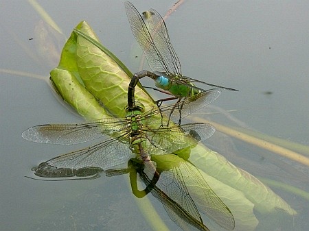 ギンヤンマは最近見なくなりましたが、コバルトブルーの身体の色が輝いて、とても美しいトンボです。連結して何回も何回も睡蓮池を巡って、睡蓮やオニバスの葉から水中に卵を産みつけていました。