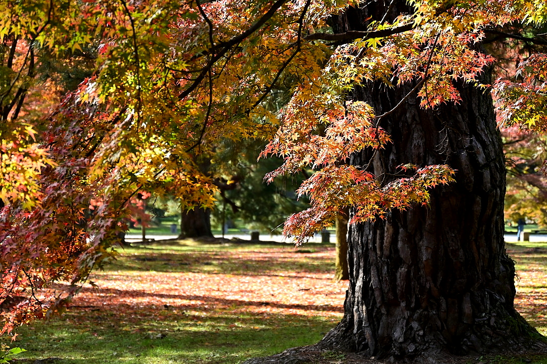 京都御所の御苑。大きな松の荒々しい幹と繊細なモミジの紅葉の
