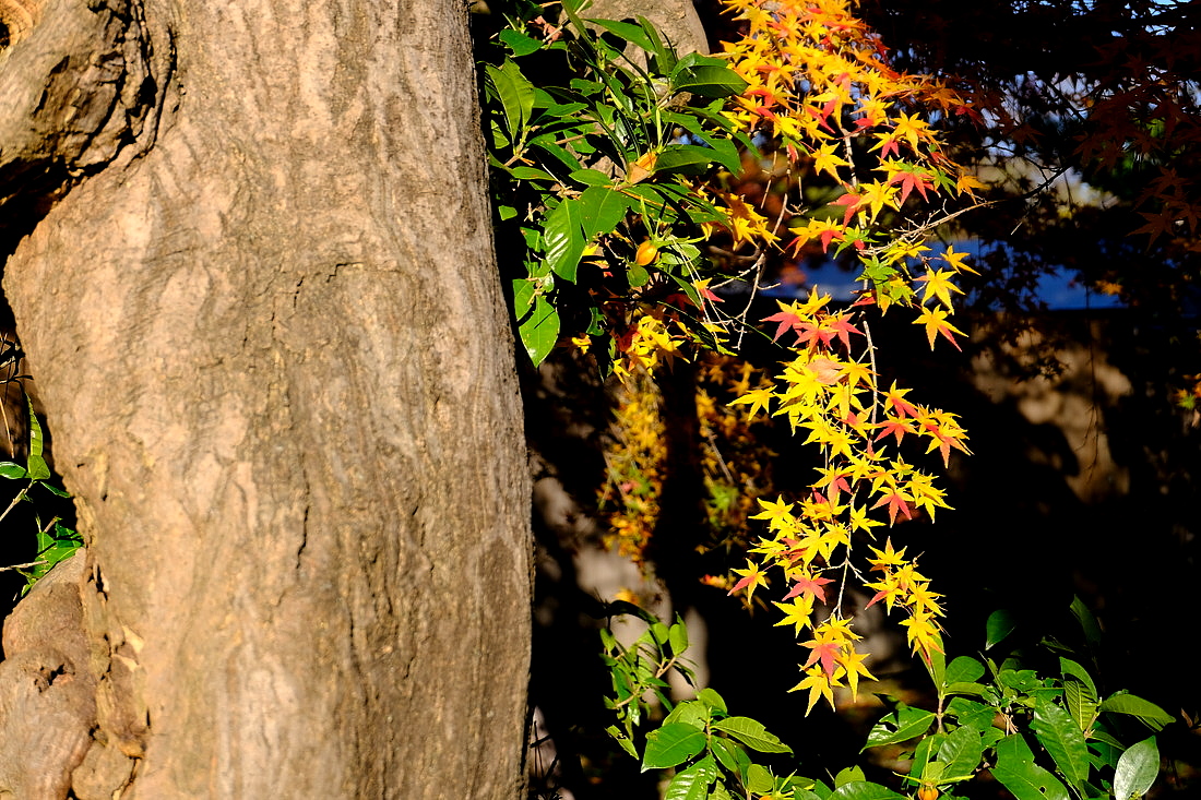 京都御所の御苑。荒々しい木肌と味わい深いモミジの色彩です。