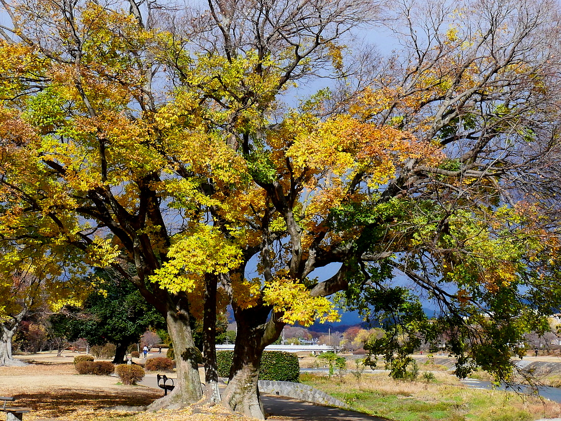鴨川(賀茂川)の川辺には、多くのエノキの大木が生えています。 これは府立医大病院の裏にあたる河川敷に生えています。背景は加茂大橋。