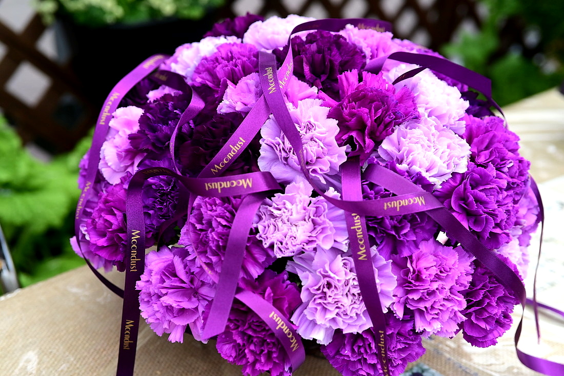 京都府立植物園の早春の野草展にて。パープル系のカーネーションの花束です。