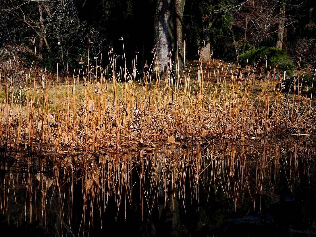 京都府立植物園の蓮池の冬は、枯れたハスの茂みが美しい姿を見せています。
