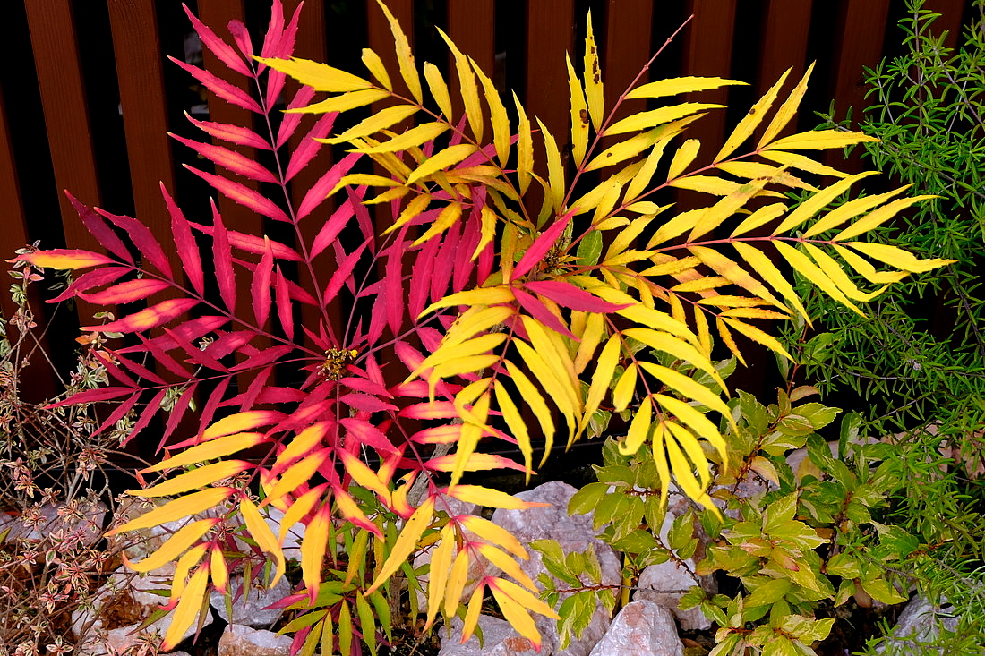 京都の住宅街で出会った美しい植栽。ホザキナナカマドという種類のようです。