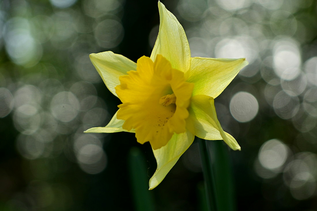 早春の野原に咲き出したラッパスイセンの花。薄黄色の花は、 春の到来を感じさせてくれます。京都府立植物園にて。