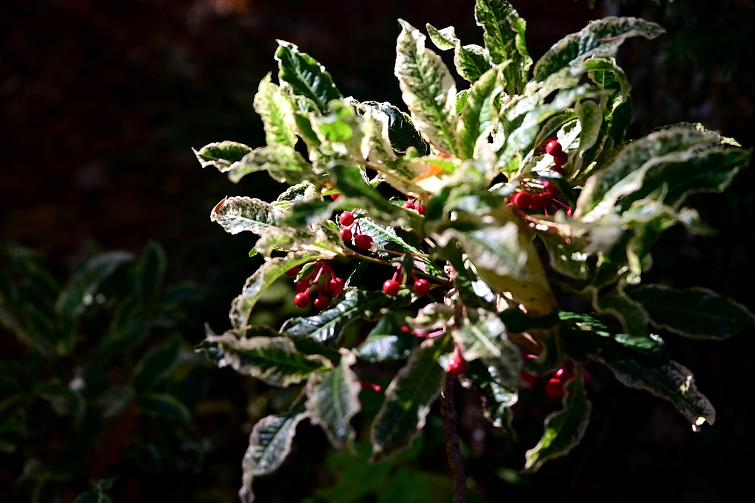 京都の街角で見かけた、斑入りで風変わりな千両です。
