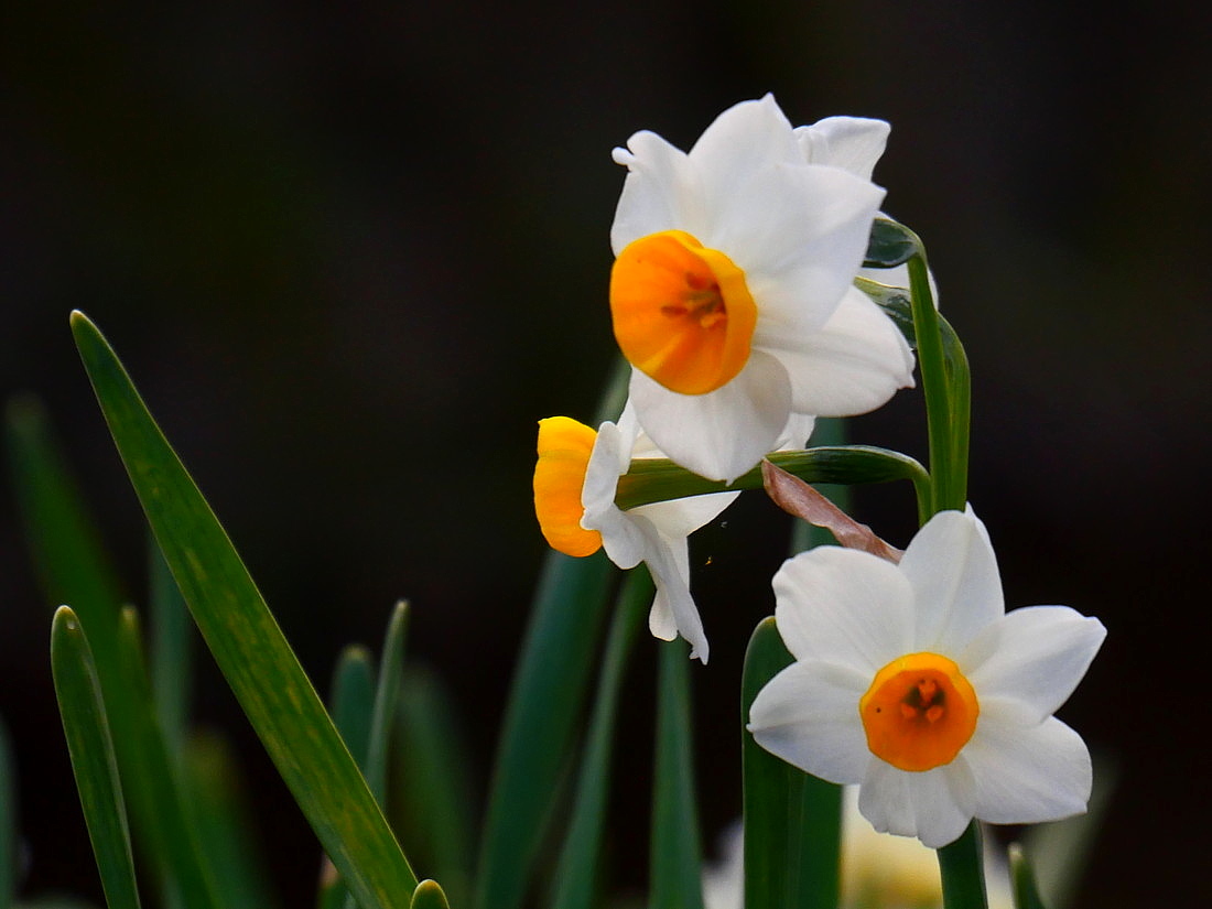 京都洛北の疎水べりの斜面に群生している水仙の花。