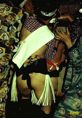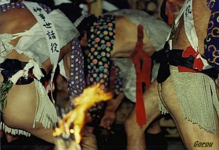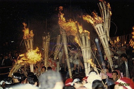 大松明が集まり立てられる。 「サイレヤ、サイリョウ」という掛け声と、太鼓のリズムで盛り上がる。